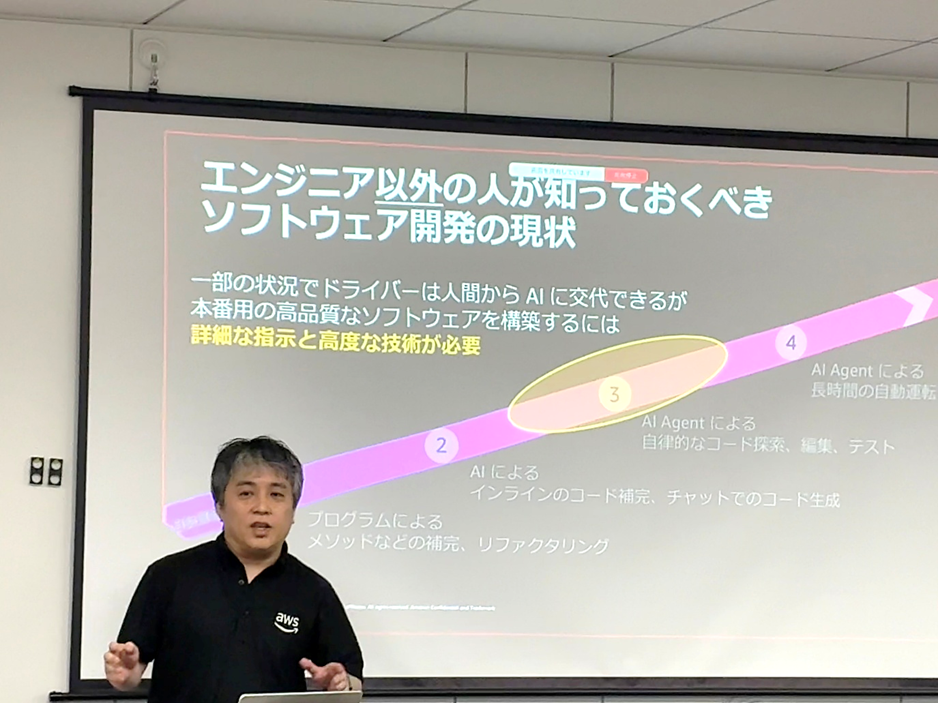 講演では、AIエージェント統合型のシステム開発環境 Kiro を例に、AIエージェントを活用した具体的な取り組みやデモンストレーションも紹介されました。
