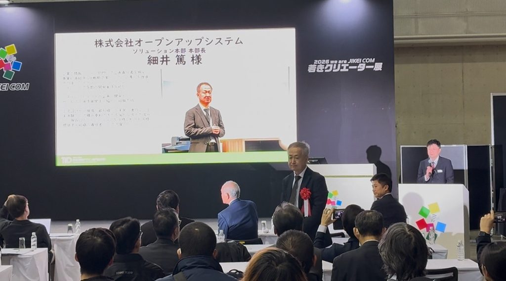 本イベントのハイライトである「JESC奨励賞」候補作品プレゼンテーションにおいて、当社株式会社オープンアップシステムの細井統括本部長が審査員として登壇いたしました。